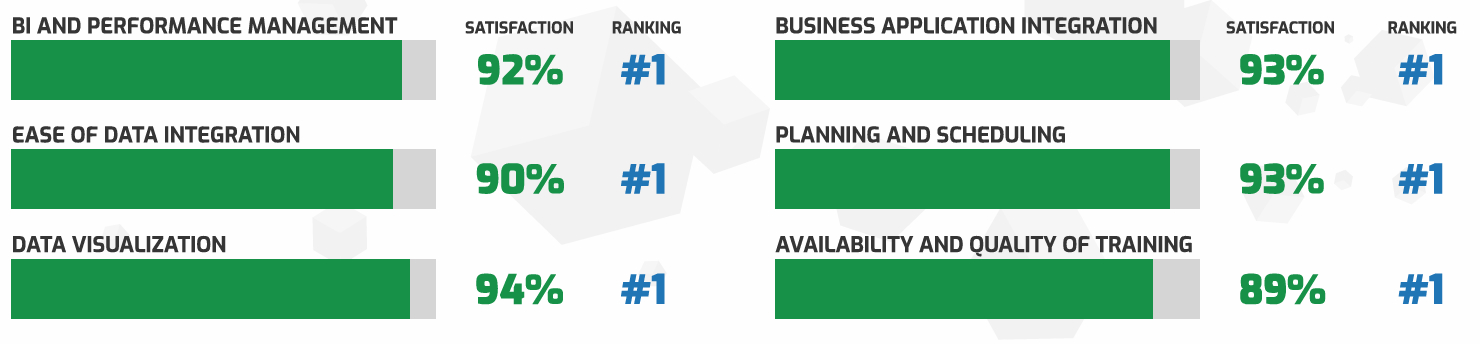 - Product Feature #1s – Planning and Scheduling, BI and Performance Management, Governance Risk and Compliance, Marketing Analytics, Data Visualization, Business Application Integration, Process Simulation and Execution, and Mobile Access